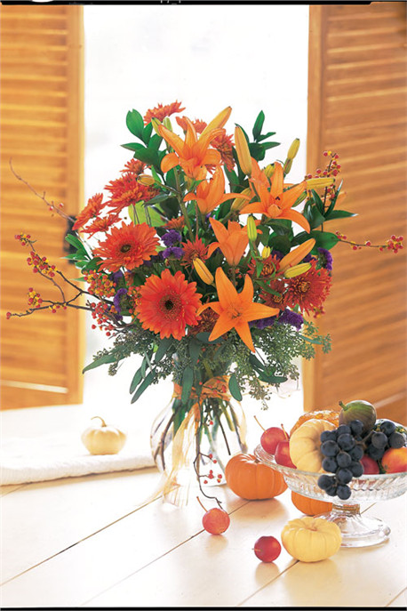 Skip to contentWith its gorgeous orange flowers and fresh fall scent, this autumn sunshine arrangement is wonderful for any ghost or goblin. Perfect for Thanksgiving, too. Approximately 22″ W x 25″ H.