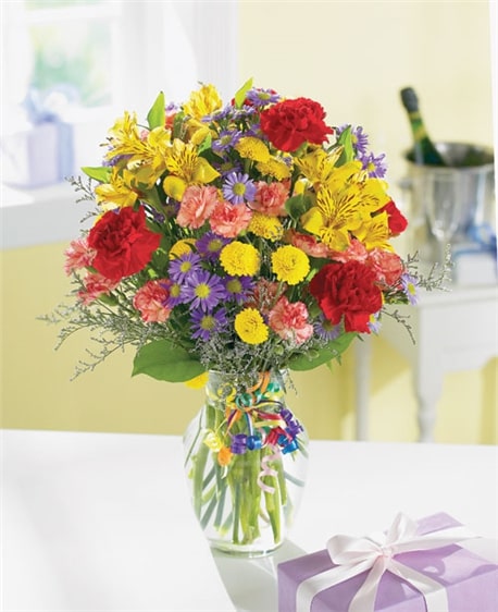 Skip to contentWith an abundant array of bright red, yellow, and purple flowers, this arrangement is sure to brighten your day. Approximately 12″W x 13″H. Picture is example of deluxe size.