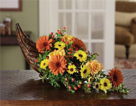 Skip to contentThis breathtaking array of fall colors and textures is enough to take anyone’s breath away. Makes a great Thanksgiving centerpiece or decoration. The captivating cornucopia is approximately 21”W x 14”H.