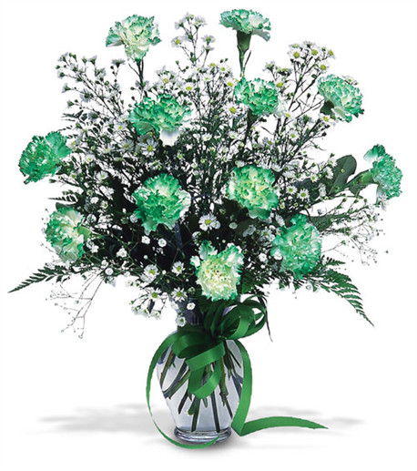 Skip to contentCelebrate St. Patrick’s Day this year with a dozen green carnations arranged in a glass vase.