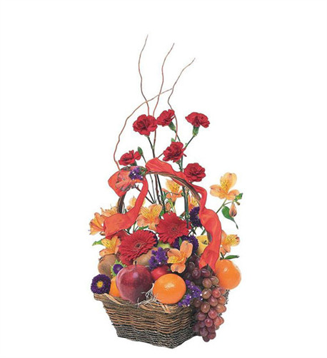 Skip to contentCan’t decide – flowers or fruit? Now you don’t have to with our Flowers and Fruit combination gift basket. Approximately 12″ W x 20″ H.