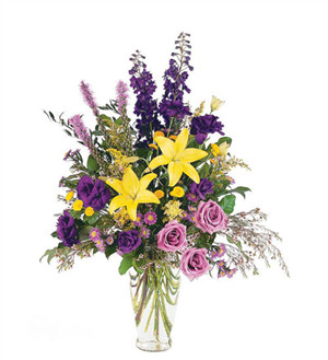 Skip to contentWith it’s gorgeous yellow and purple flowers, this beautiful arrangement will be a reminder to all that love is everlasting. Approximately 29” W x 38” H.