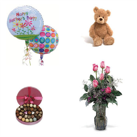Skip to contentDon’t need the full dozen? This economy pack includes a half dozen pink roses, a cuddly bear, a box of yummy chocolates and two mylar balloons.