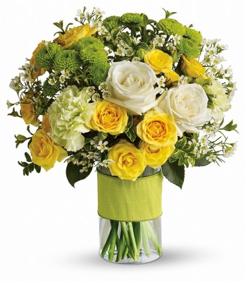 Skip to contentGo all our with our most extravagant arrangement for St. Patrick’s Day – includes white and yellow roses. Approximately 20” H x 14” W