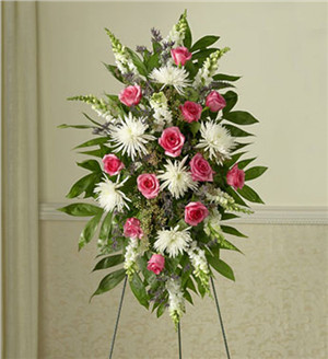This soft pink spray with its carnations, roses and greens holds the promise of a brighter tomorrow. Approximately 27”W x 40”H.