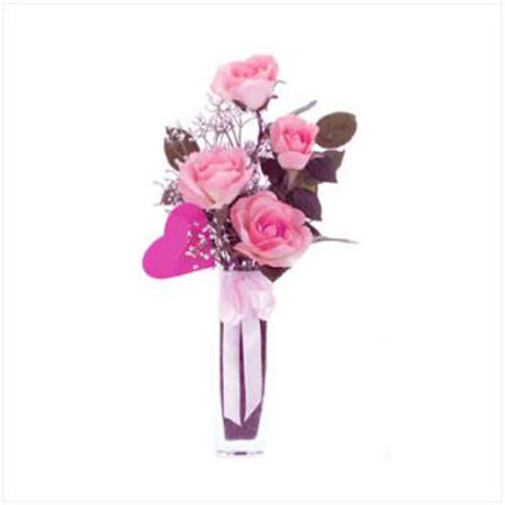 Skip to contentSend a bit of enchanting charm to a friend or loved one with this vase of joyful pink roses. Approximately 22″W x 9″ H.