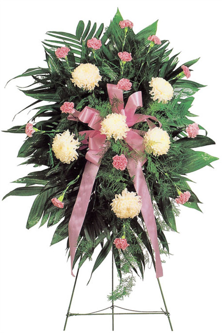 Skip to contentThis standard spray focuses on white flowers with a hint of pink. Approximately 32”W x 48”H.