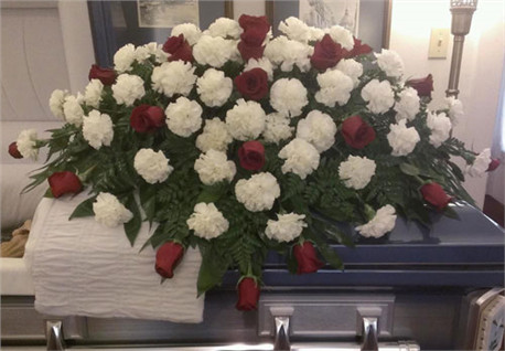 Skip to contentPictured as a Full spray here approximately 55” wide, also available as a Half spray. This beautiful yet simple casket spray is filled with the freshest greens, white carnations all highlighted with red roses. Half spray approximately 30” wide.