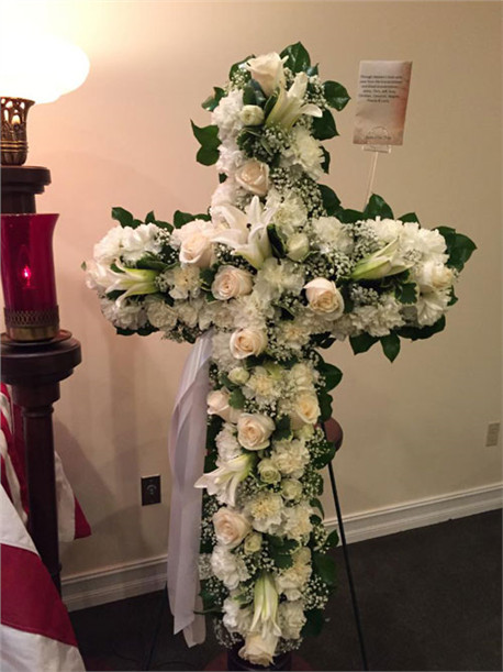 Skip to contentThis standing spray arrangement – in the shape of a cross – is created from fresh white roses, lilies and carnations for a meaningful tribute. Approximately 26” W x 37” H.